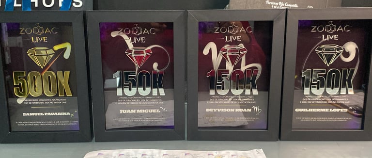 A placa de graduação Zodíac Live é um ítem exclusivo entregue ao Influenciador por marcos de conquistas dentro da agência, seja marco de diamantes faturados, marco de seguidores ou marcos de comunidade(fã clube de lives), uma verdadeira obra de arte que carrega além da nossa identidade visual e a conquista obtida pelo criador, as particularidades individuais como nome e signo do Streamer.